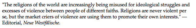 Editorial Westfälische ueber Religionen. Selbst Zeitungen versuchen weiterhin aus verschieden Gründen die Bürger für Dumm zu verkaufen. Alle Religionen können niemals gewalttätig sein? Wer kommt auf so einen Schwachsinn? Warum sollte es keine gewalttätigen Religionen geben. Man denke z.B. an die Menschenopfer-Kulte der Azteken oder die kannibalistischen Südsee Religionen. Wer so ein Editorial schreibt ist entweder strunzdumm, strunznaiv, beides oder ein radikaler Moslem.