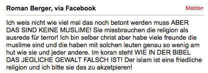 Wie wir es bereits kennen, gibt es aber natürlich immer noch (und wird es auch immer geben) einige Unbelehrbare die uns den Islam immer noch als tolerante Friedenslektion verkaufen wollen. Sei es mit einer Lüge als Schutz ihrer eigenen Religion (Taqiyya) oder einfach aus Dummheit und Unwissenheit gepaart mit einer rosa-roten Brille.