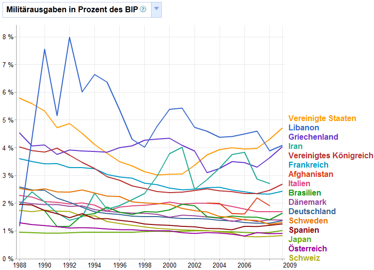 Werfen wir doch mal einen Blick auf die Militärausgaben verschiedener Länder im Vergleich zum Bruttoinlandsprodukt – Google scheint da gerade ein nettes, neues Tool für diese Aufgabe zu haben.