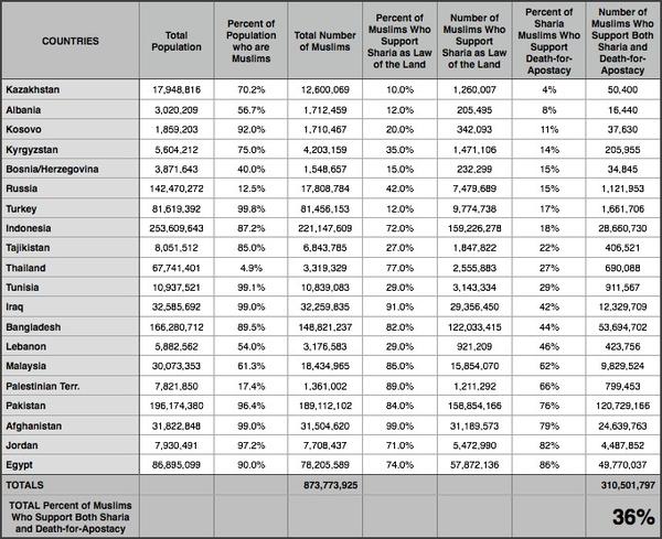 Statistik über Muslime, betreffend Unterstützung für die Scharia (islamische Gesetzgebung) und explizit über die Befürwortung der Todesstrafe von Apostaten (Moslems die den Islam verlassen haben):
